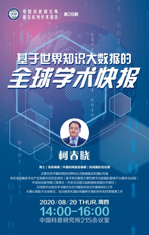 8月20日,中国科普研究所前沿系列学术报告第28期如期举办,本期报告人是中国知网副总编辑、高级编辑、知网国际总经理柯春晓博士,报告主题为“基于世界知识大数据的全球学术快报”。