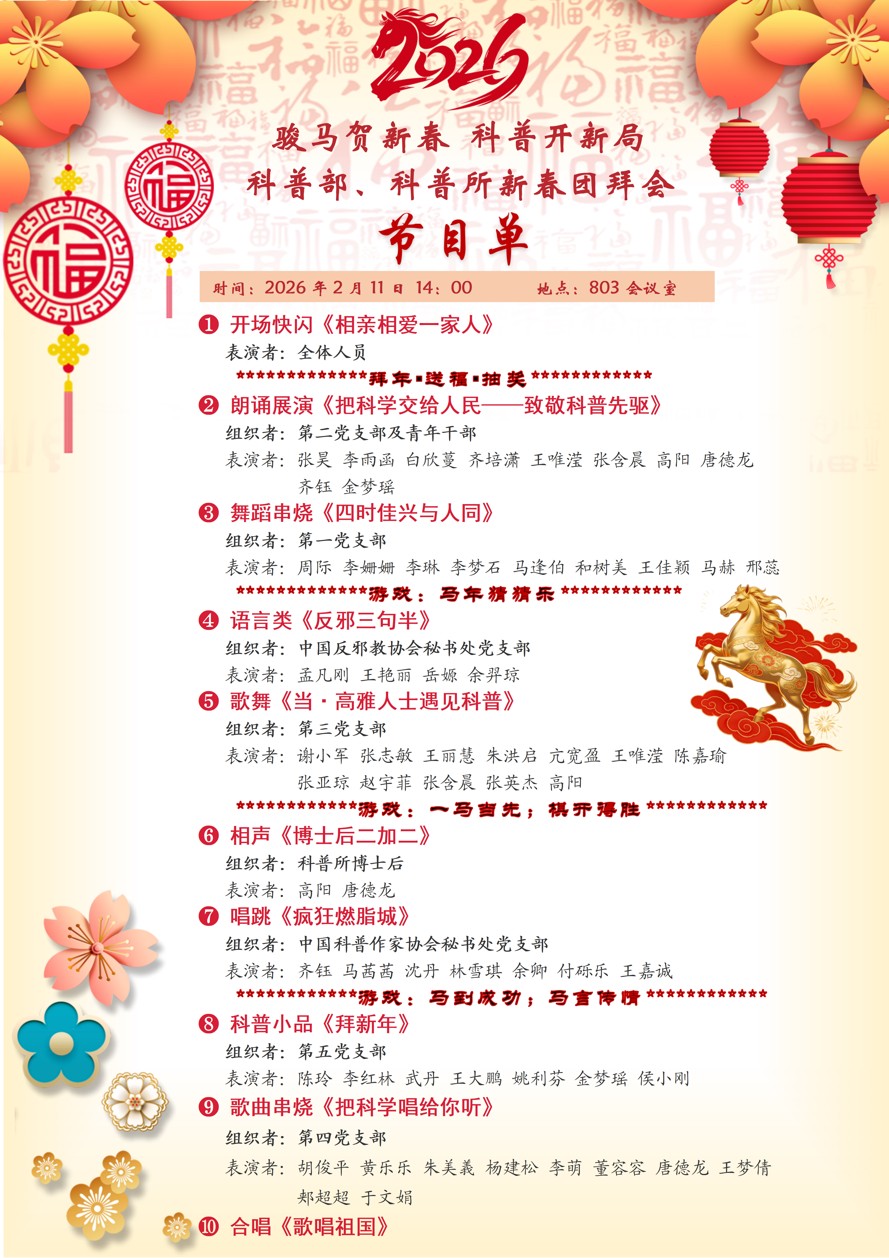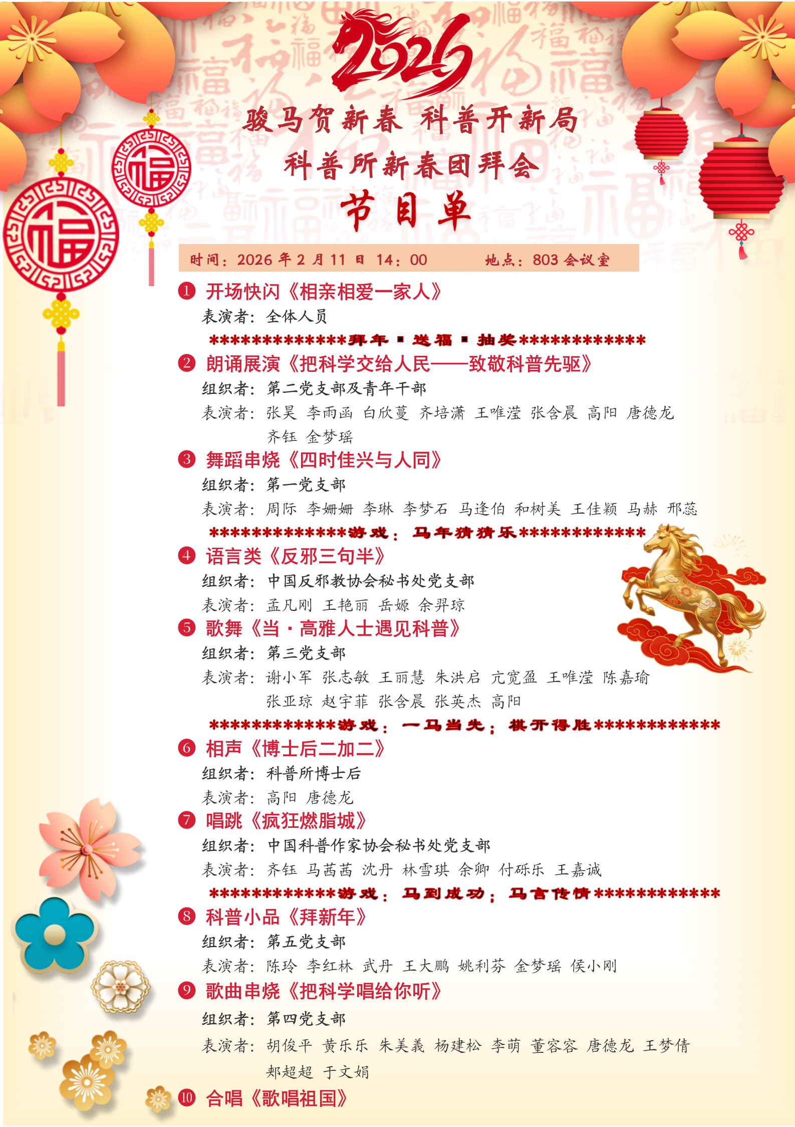 此次新春团拜会充分展现了科普所团结奋进、勇于创新的精神风貌,进一步鼓舞全体职工坚守初心、勇担使命,一如既往当好新时代的奋斗者、实干家。2026年,科普所将持续开展更多形式多样、内容丰富的文体活动,不断丰富职工精神文化生活,切实提升职工的幸福感和获得感,为推动科普事业高质量发展注入更强动力。