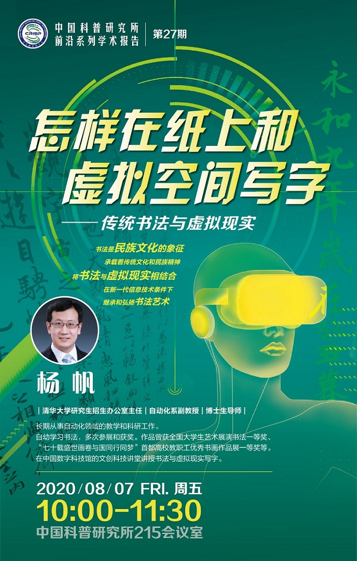 2020年8月7日,中国科普研究所前沿系列学术报告第27期如期举办,本期报告人是杨帆副教授,报告主题为“怎样在纸上和虚拟空间写字——传统书法与虚拟现实”。