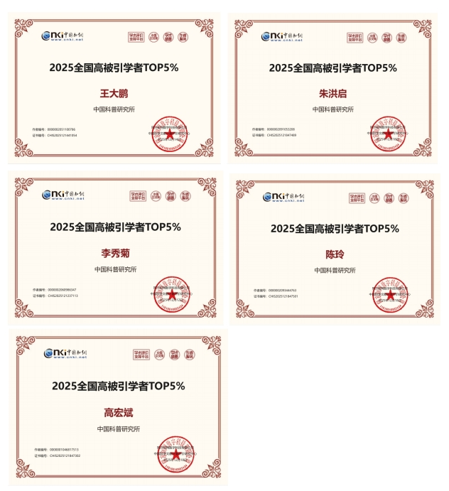 近日,中国知网下属的中国科学文献计量评价研究中心(出版智库)正式公布“2025全国高被引学者”名单。中国科普研究所王大鹏、朱洪启、李秀菊、陈玲、高宏斌5位研究人员(按姓氏笔画排序)凭借扎实的科研积累、突出的学术影响力,成功入选 TOP5%名单,是科普所在高水平科研产出方面取得的重要突破,进一步提升了科普所学术声誉。